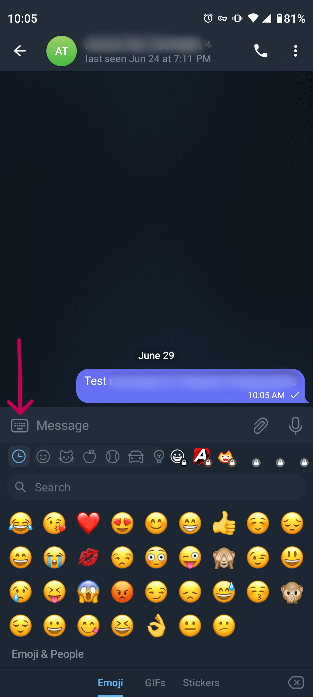 To the left of the message bar, you will see the Telegram’s emoji icon. Tapping on it will open the option where you can choose among Telegram emojis, gifs, and stickers.