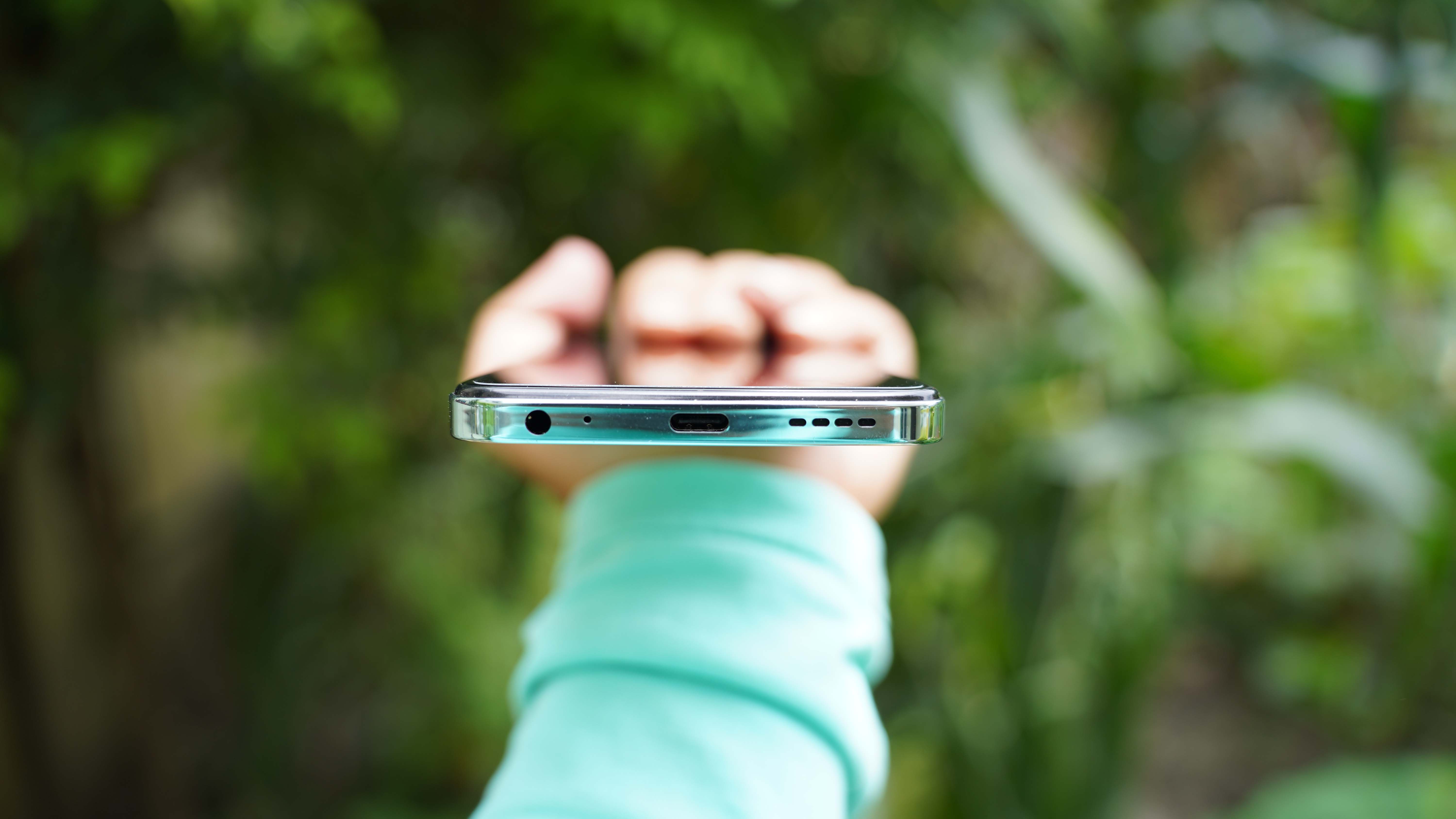 Moving to the ports and buttons, the bottom side has a 3.5mm headphone jack, microphone, USB-C port, and a speaker.