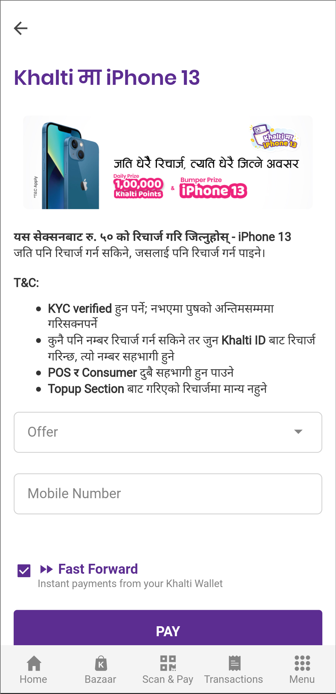 Both the Khalti Pasal/Dealer (POS) and general consumer can enter the campaign. To increase the chances of winning, users can do multiple transactions as well.