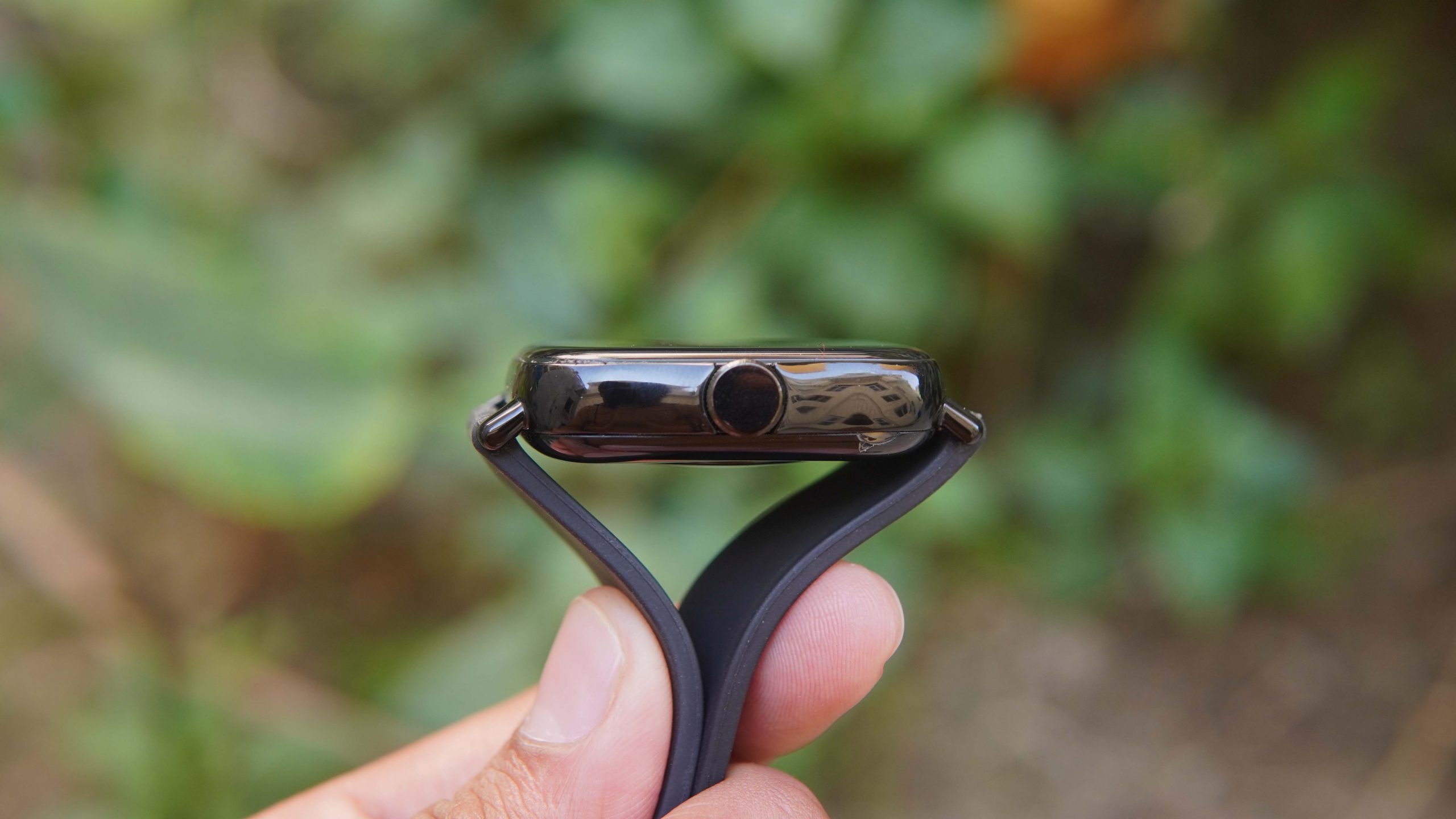 Purple Alpha has a square-shaped body that measures 42.8×35.6×9.7mm. There’s a button on the right that illuminates at night.