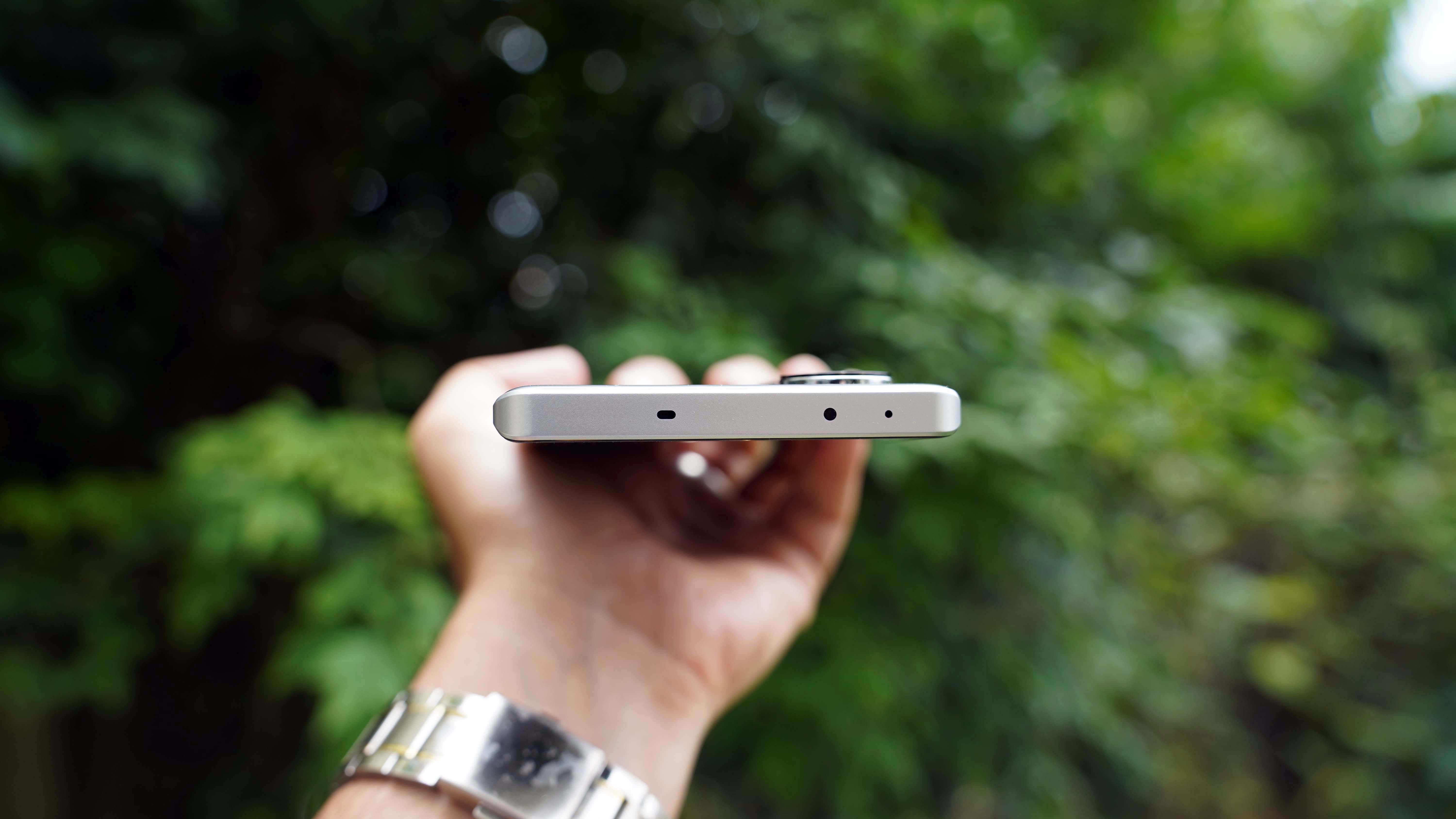 The left side of the frame is clean, while the top houses an IR Blaster and a speaker hole for the secondary speaker. At the bottom, you’ll find a speaker outlet, USB Type-C port, microphone, and dual SIM slot. However, there’s no 3.5mm audio jack.