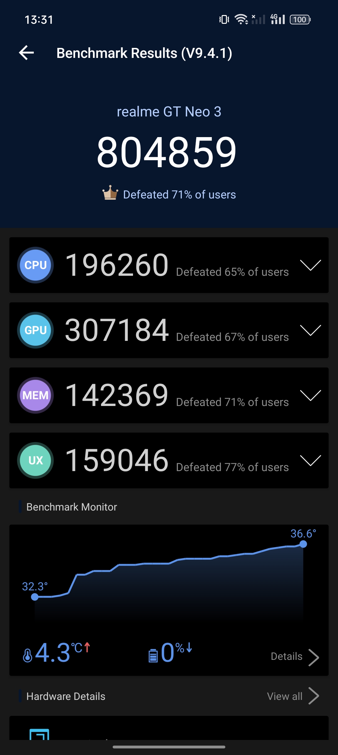 In GeekBench v5.4.4 it manages to achieve a single-core score of 963 and a multi-core score of 4032. With this, it beats the Xiaomi 12 Pro and Realme GT 2 Pro in multi-core score.