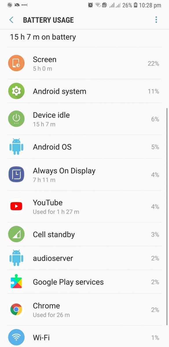 This phone easily lasts from 7:00 in the morning to 11:00 at night. One day, when I didn’t play a single PUBG game at all but spent a lot of time on YouTube, streaming Spotify on Ncell’s 4G network, capturing photos, and recording videos that I won’t see after I took them (you can see the time spent on each activity in the screenshot below), I rested my phone with about 26% charge left.
