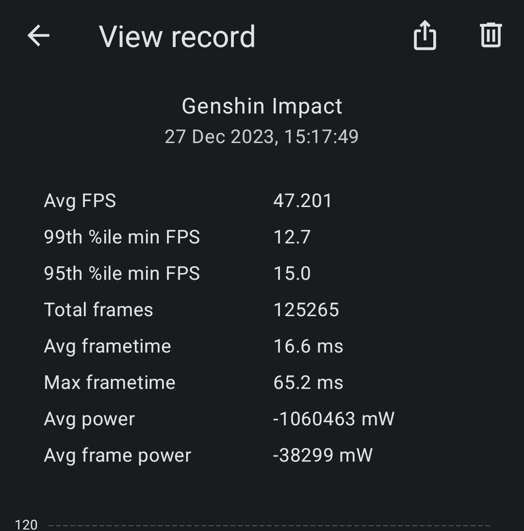 I tested Genshin Impact on Medium Graphics and a 60 FPS Frame limit. During our 40 minutes of gameplay, the Samsung S23 FE averaged 55 fps. The screenshots below show an average FPS of 47, reflecting a pause in the game for more than 5 minutes. The average score of 55 fps is considered after removing the idle gameplay time frame.
