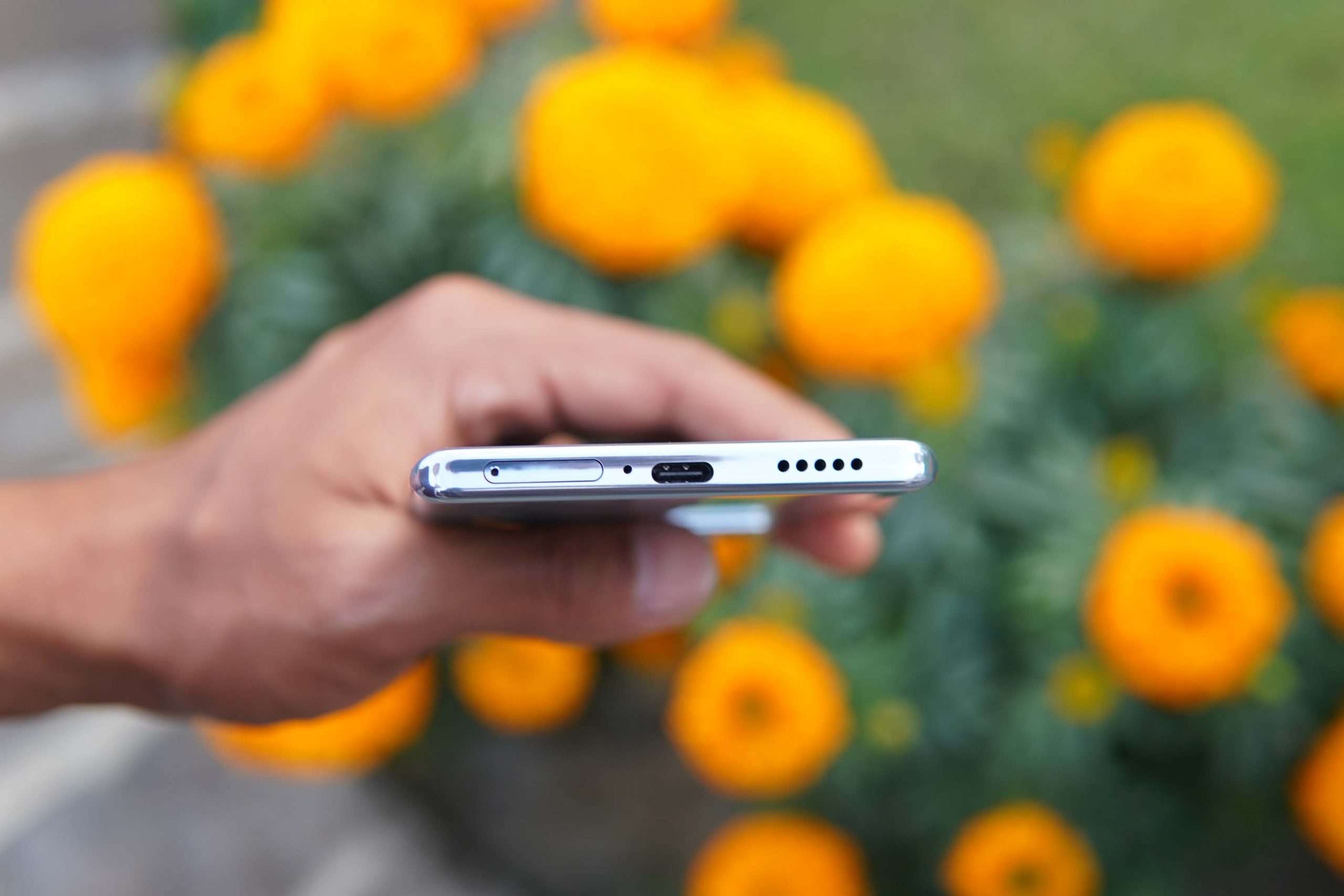 It has USB-C on the bottom alongside a mic, speaker, and a dual sim slot. On the top, there’s a secondary microphone.